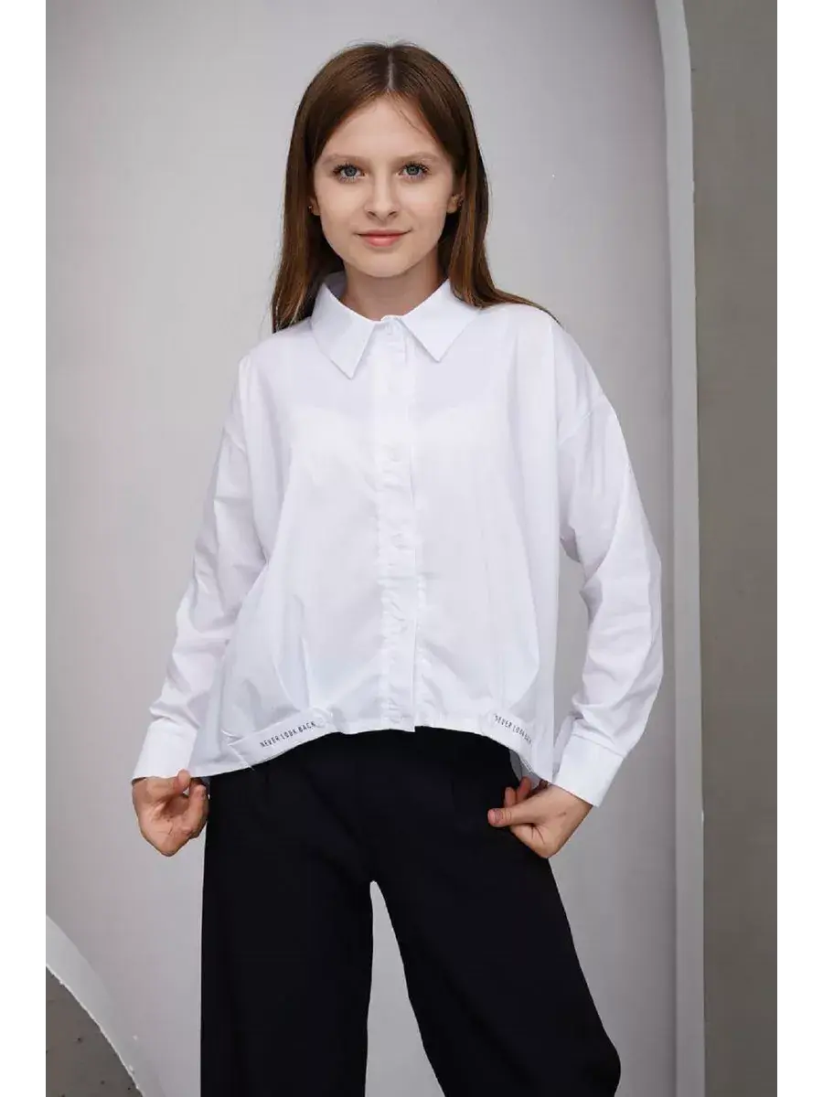 Свободный прямой оверсайз силуэт с заниженной линией плеча позволяет ребенку свободно двигаться, не стесняясь в своих движениях. Модель с длинными рукавами, которые делают ее идеальным выбором для прохладных дней. Передняя часть блузки короткая, задняя более длинная, что делает ее еще интереснее.