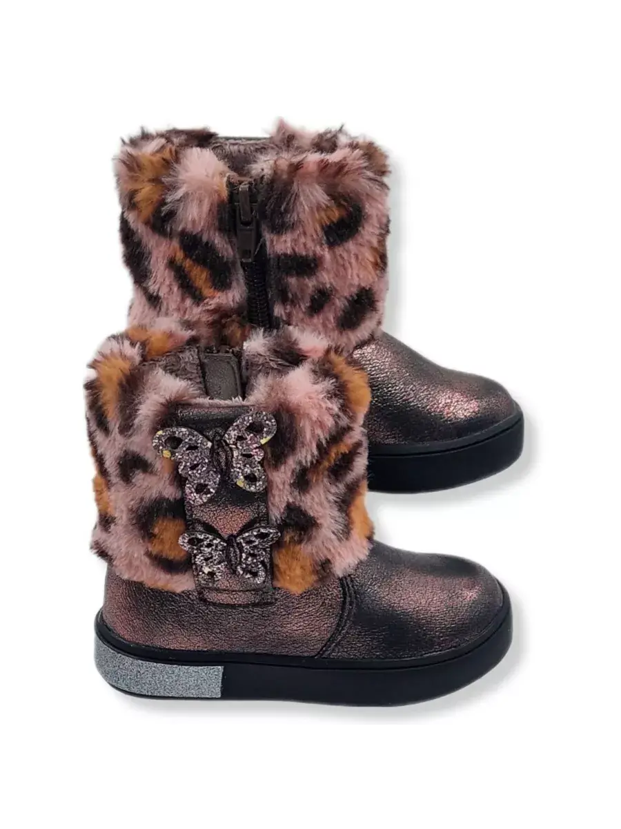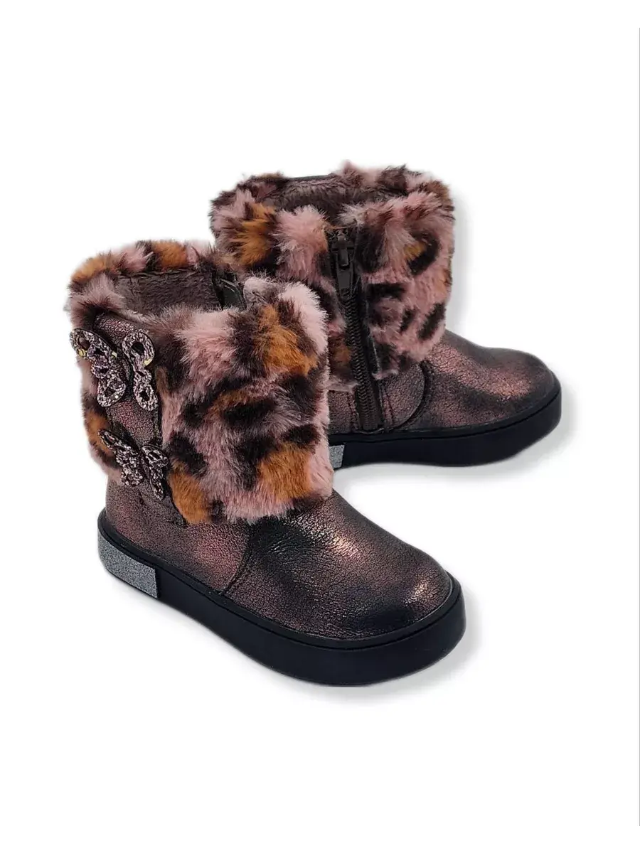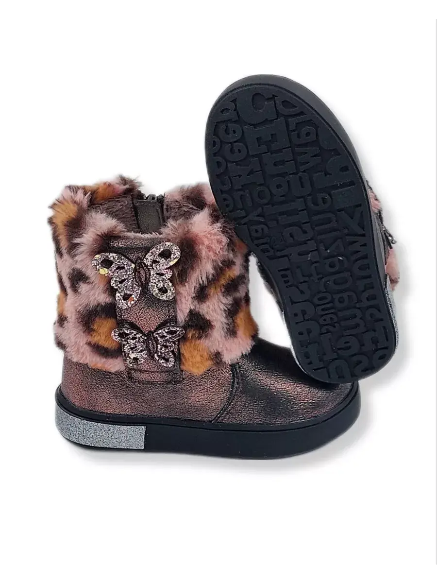 Демисезонные ботинки для девочки с подошвой из термопластичной резины и байковой стелькой и подкладкой. Верх выполнен из искусственного меха и эко-кожи с леопардовым рисунком в розовых тонах.