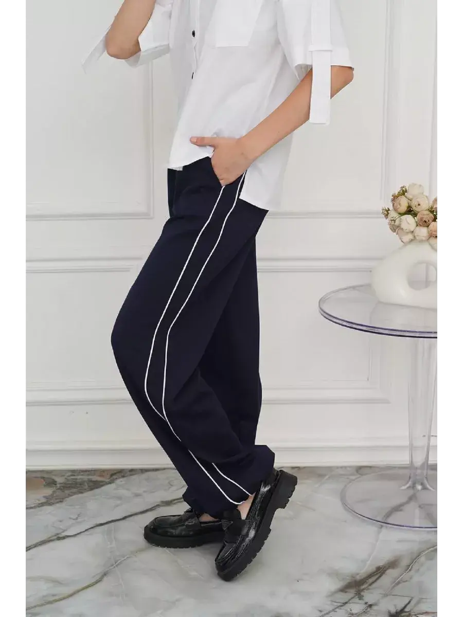 Модель свободного прямого кроя имеет среднюю посадку на талии, широкую резинку в поясе, врезные карманы на бедрах, утяжка снизу на штанах.