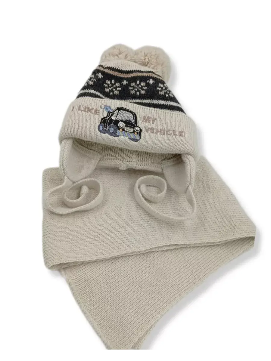 Детский вязаный комплект для мальчика шапка с помпонами и шарфом на весну и осень. Данная демисезонная модель подойдет для мальчика от года до двух лет.