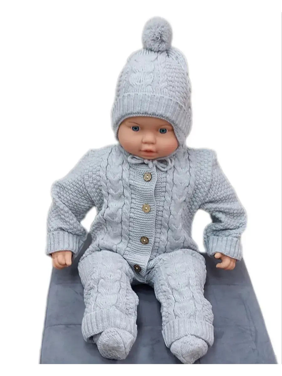Детский вязаный комбинезон для мальчика и девочки от 3 до 6 месяцев ,носочки и шапочка в комплекте.