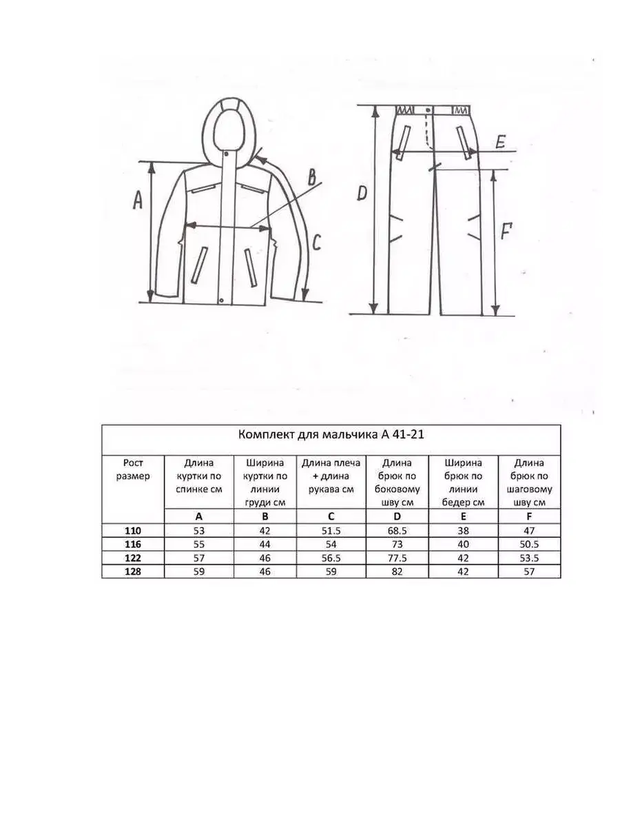 Куртка с трикотажными манжетами. Брюки с напульсниками и регулируемыми бретелями. Нижняя часть брюк регулируется липучкой.