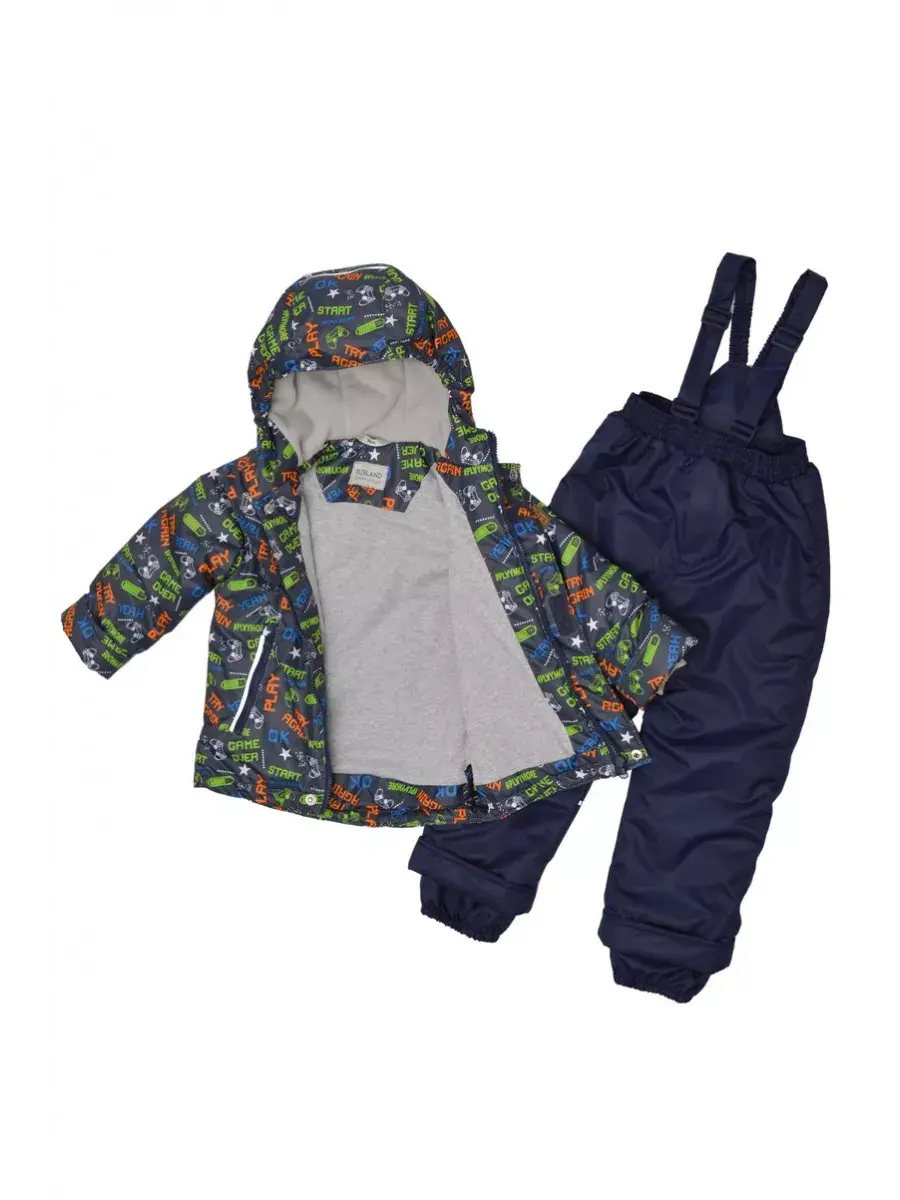 Куртка с трикотажными манжетами. Брюки с напульсниками и регулируемыми бретелями. Нижняя часть брюк регулируется липучкой.