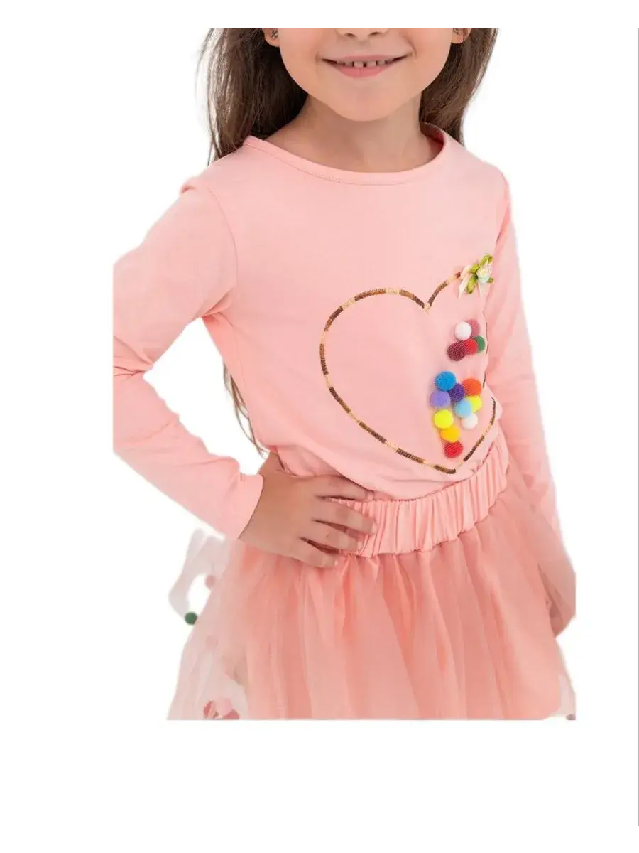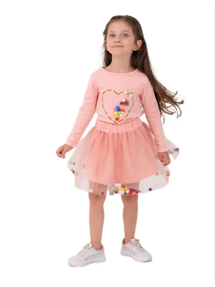 Летний костюм из легкого трикотажа украшен принтом сердце на логсливе и шариками разноцветными внутри,а так же в юбке .