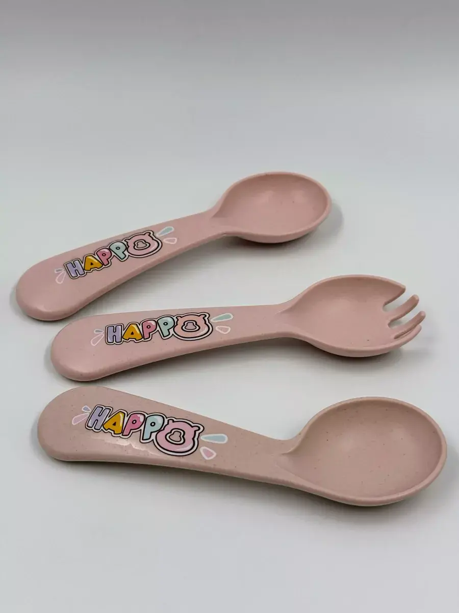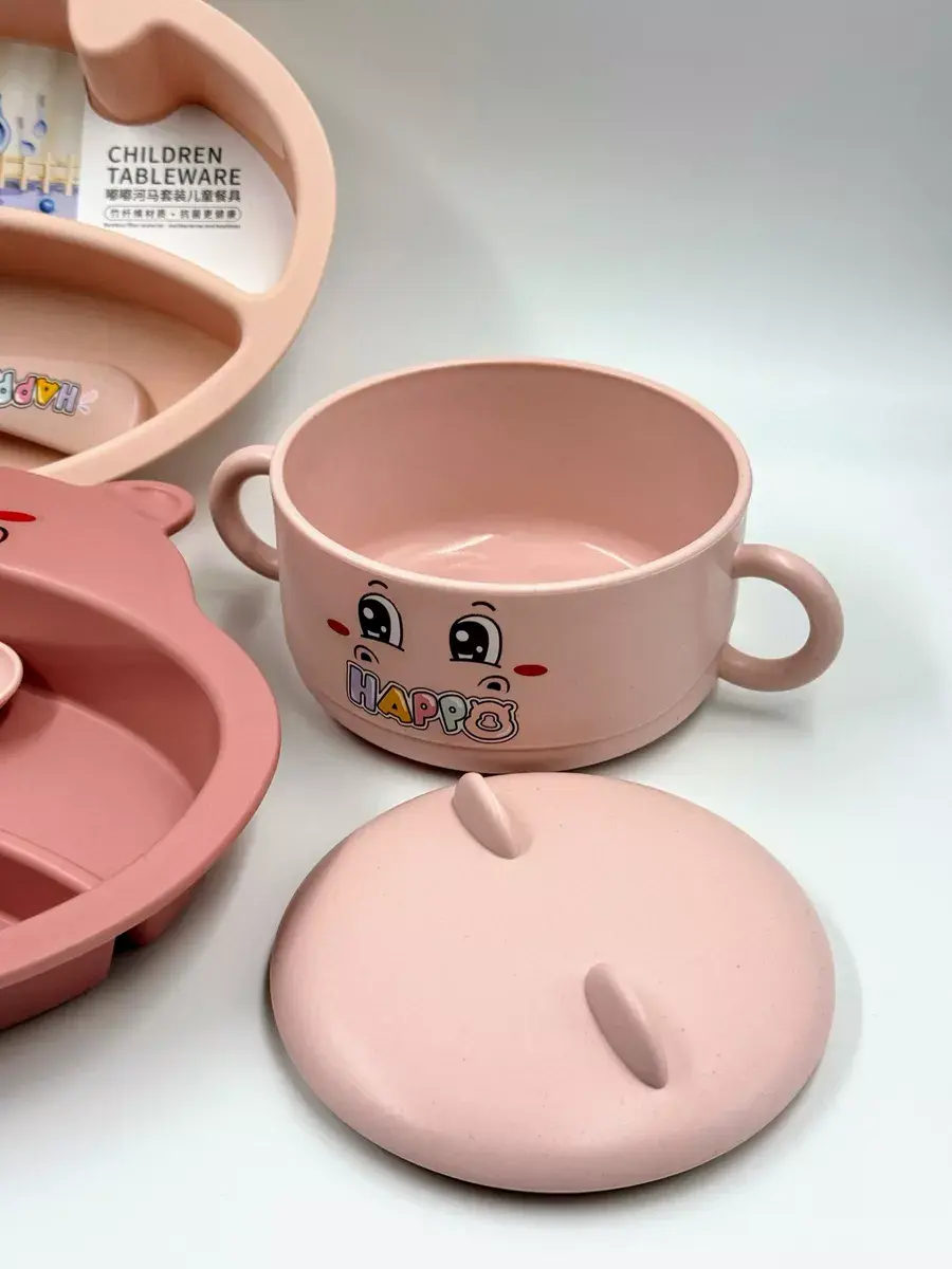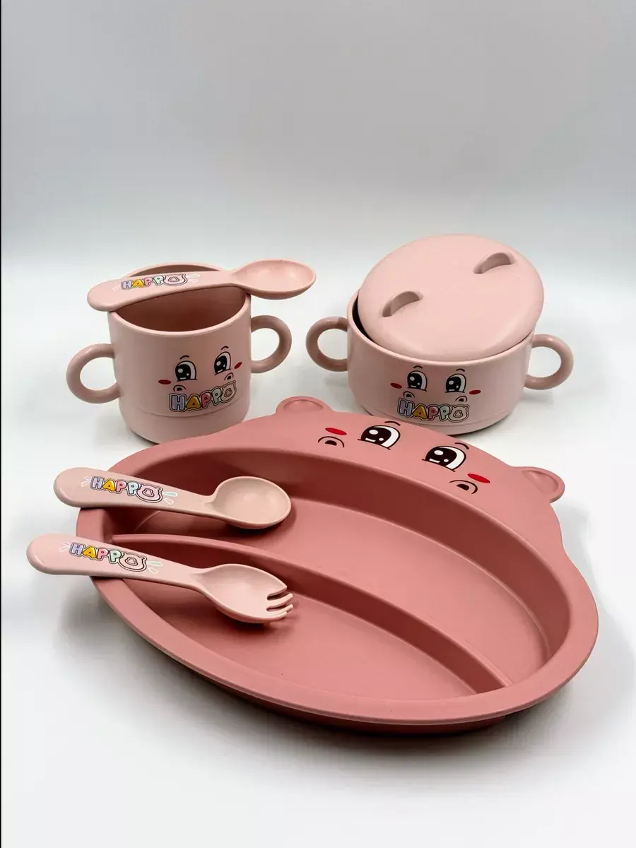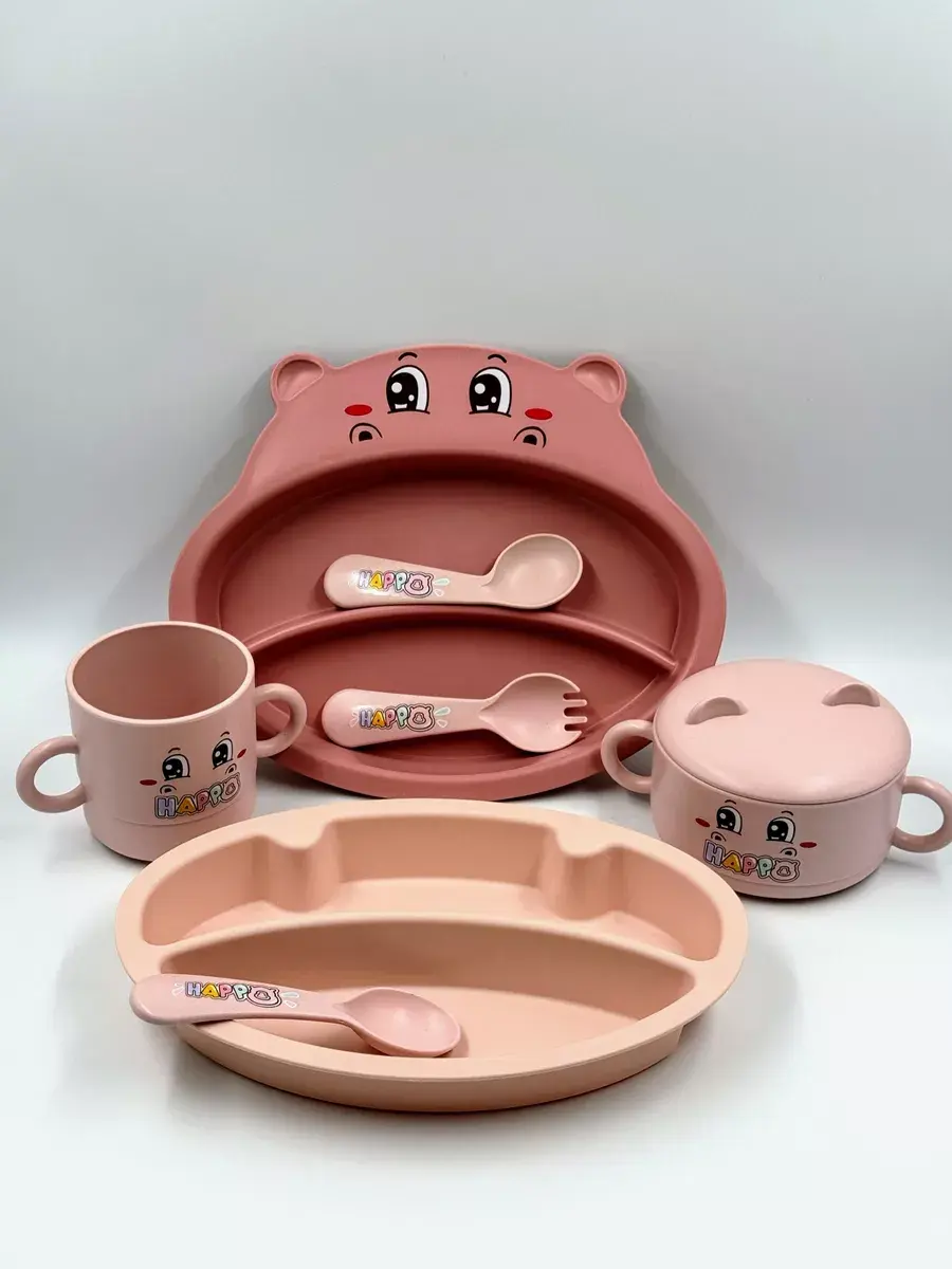 В комплект входят тарелка с отделениями, миска, чашка, вилка, ложка прямая и изогнутая (такой ложкой особенно удобно кормить детишек, с ней они не будут давится) и глубокая миска с крышкой.