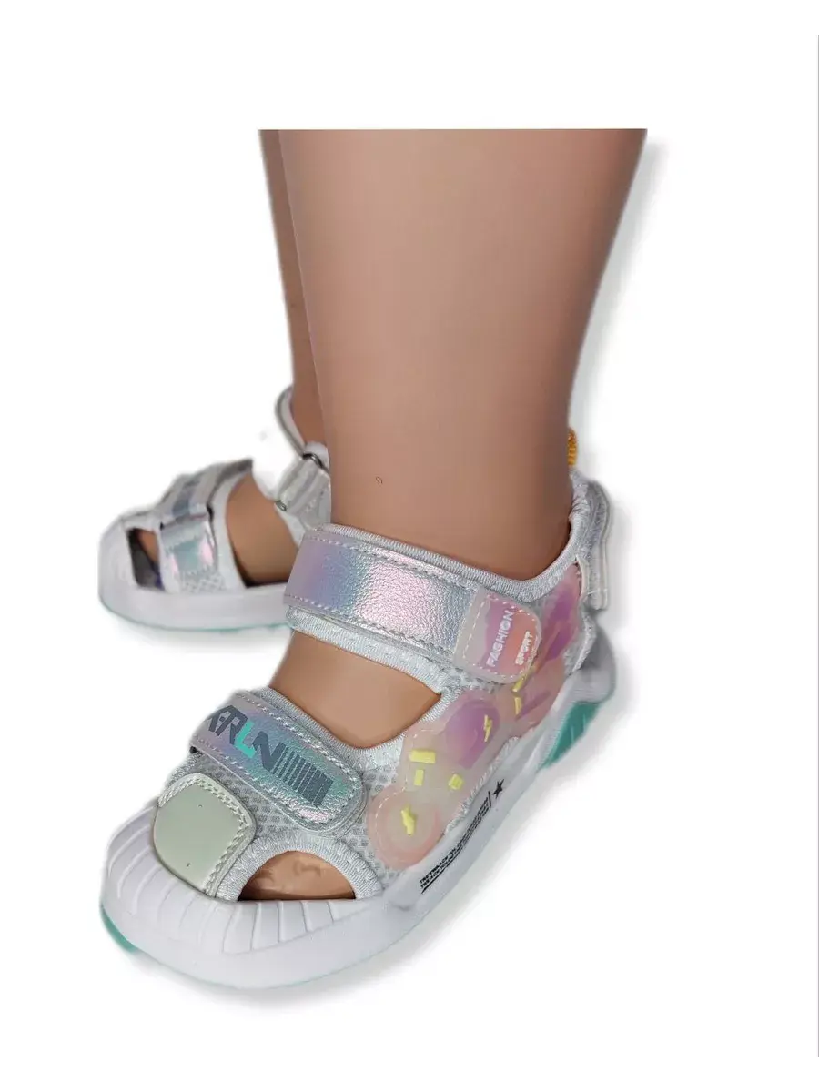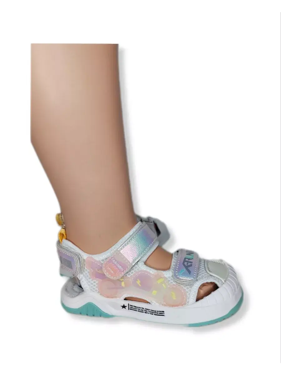 Сандалии для девочки со стелькой из натуральной кожи с супинатором, подошвой из термопластичной резины и верхом из комбинированных искусственных материалов.
