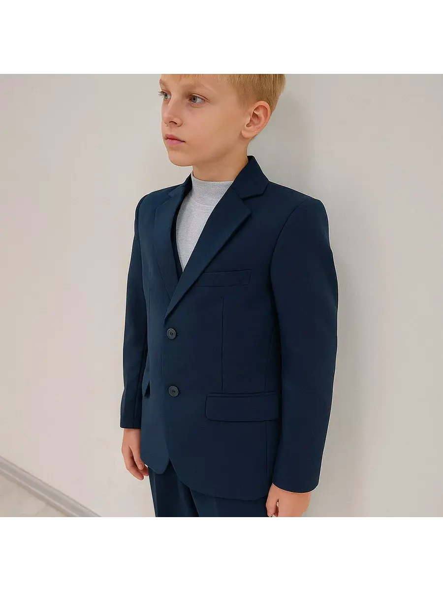 Расцветка костюма выполнена в классическом темно -синем цвете, что добавляет ему изысканности и строгости.